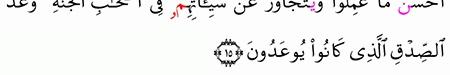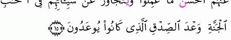 أ ول ئ ك ال ذ ين ن ت ق ب ل ع ن ه م أ ح س ن م ا ع م ل وا و ن ت ج او ز ع ن س ي ئ ات ه م ف ي أ ص ح اب ال ج ن ة و ع د الص د ق ال ذ ي ك ان وا ي وع د ون القران الكريم