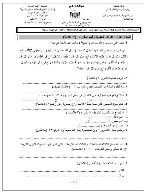 اختبار في الوحدة الأولى لمادة اللغة العربية الأحاديث النبوية بطيبة أسلوب الشرط الجازم وغير الجازم للصف الحادي عشر الفصل الثاني موقع المتقدمون