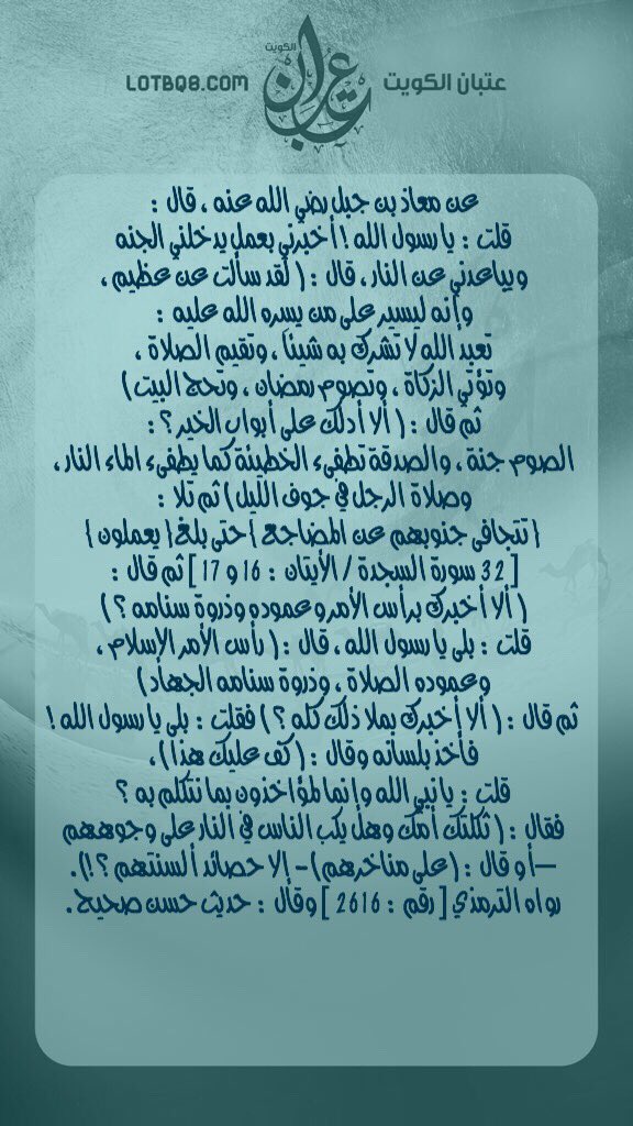 عتبان الكويت Otaibh Of Kuwait A Twitter الحديث التاسع والعشرون الأربعين النووية عن معاذ بن جبل رضي الله عنه قال قلت يا رسول الله أخبرني بعمل يدخلني الجنه ويباعدني عن النار