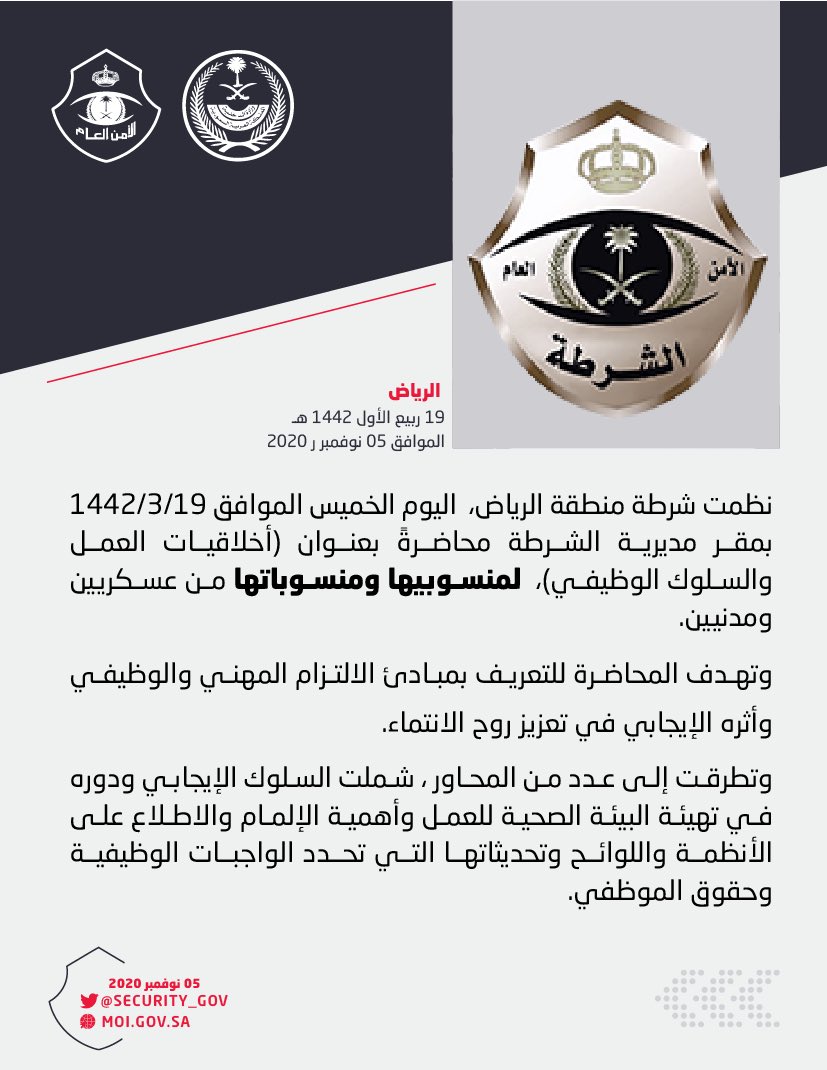 الأمن العام No Twitter نظمت شرطة منطقة الرياض محاضرة بعنوان أخلاقيات العمل والسلوك الوظيفي لمنسوبيها ومنسوباتها من عسكريين ومدنيين
