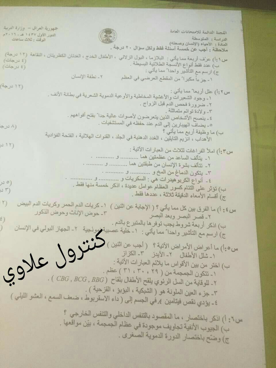 اسئلة مادة الاحياء للصف الثالث متوسط الدور الاول اليوم 11 6 2016