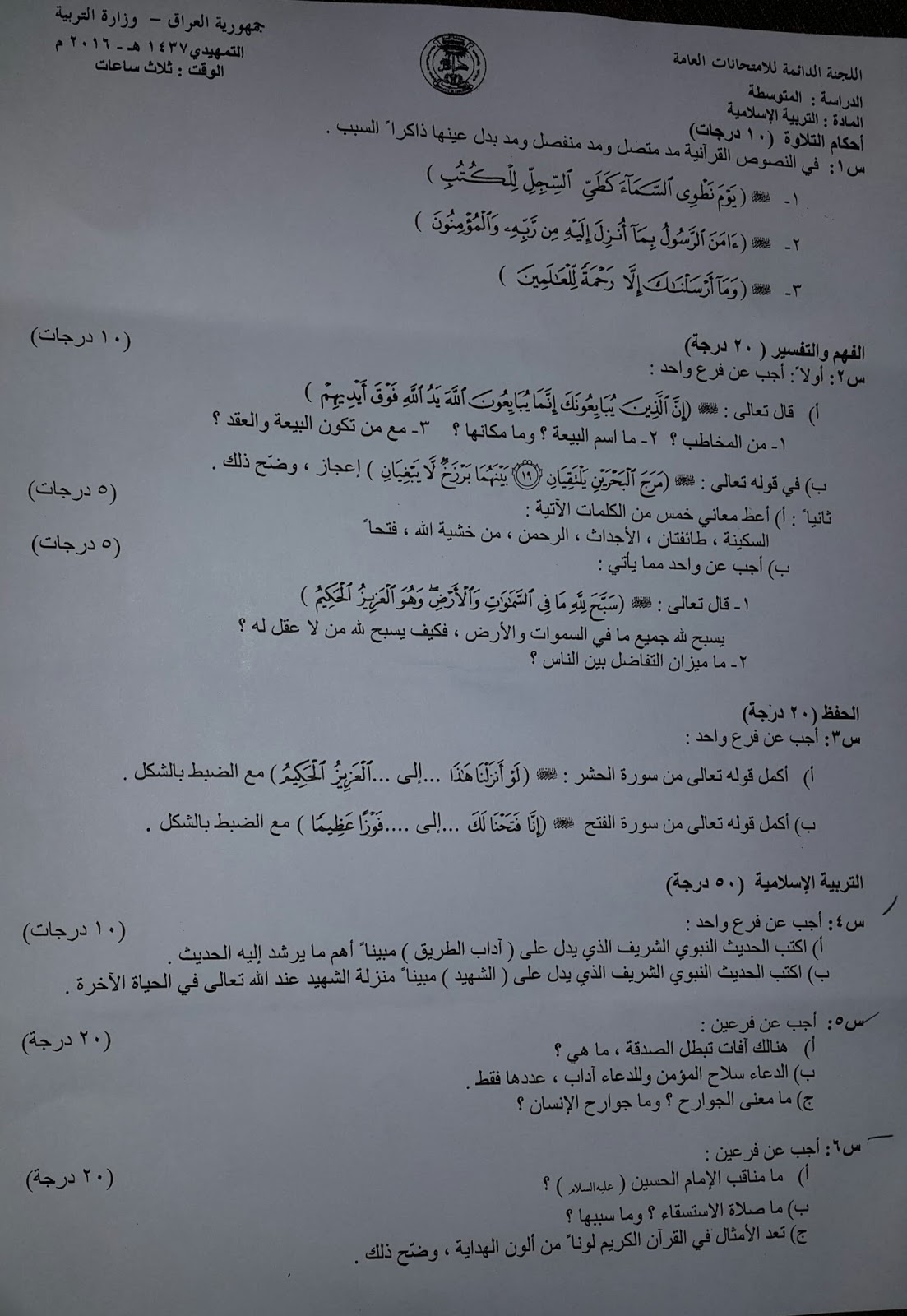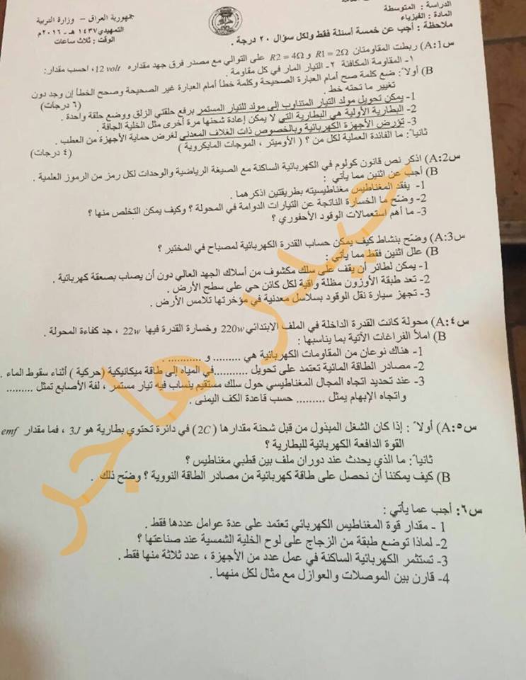 الاسئلة الوزارية للصف الثالث المتوسط التمهيدي لجميع الاسئلة لسنة 2016