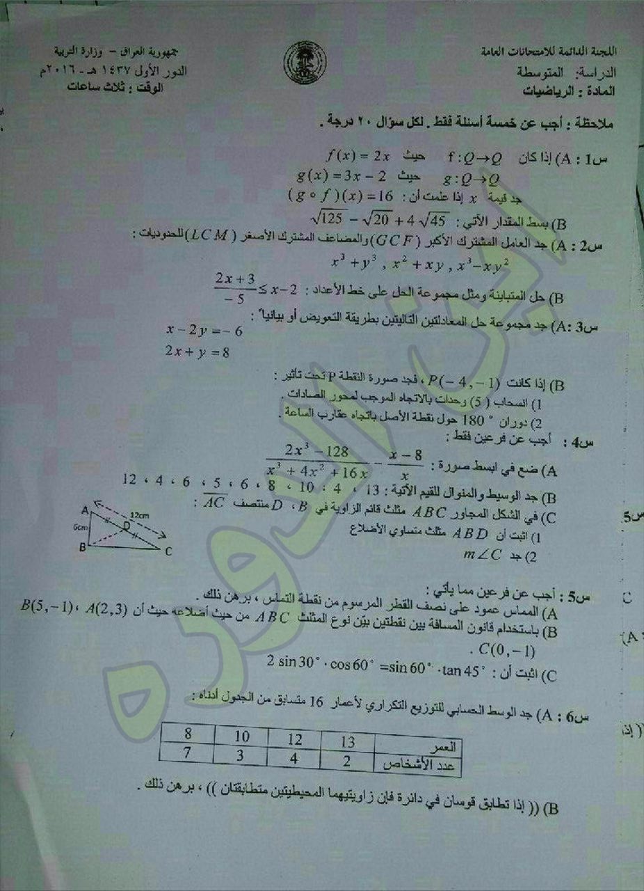 اسئلة امتحان الرياضيات للصف الثالث متوسط الدور الاول 2016