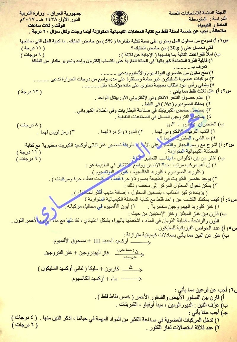 اسئلة الكيمياء للصف الثالث متوسط 2016 الدور الاول