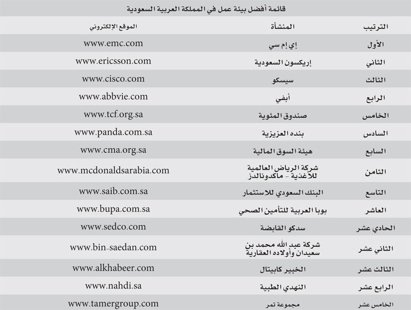 من هي الجهات التي تؤمن أفضل بيئات عمل في في المملكة العربية السعودية أريبيان بزنس