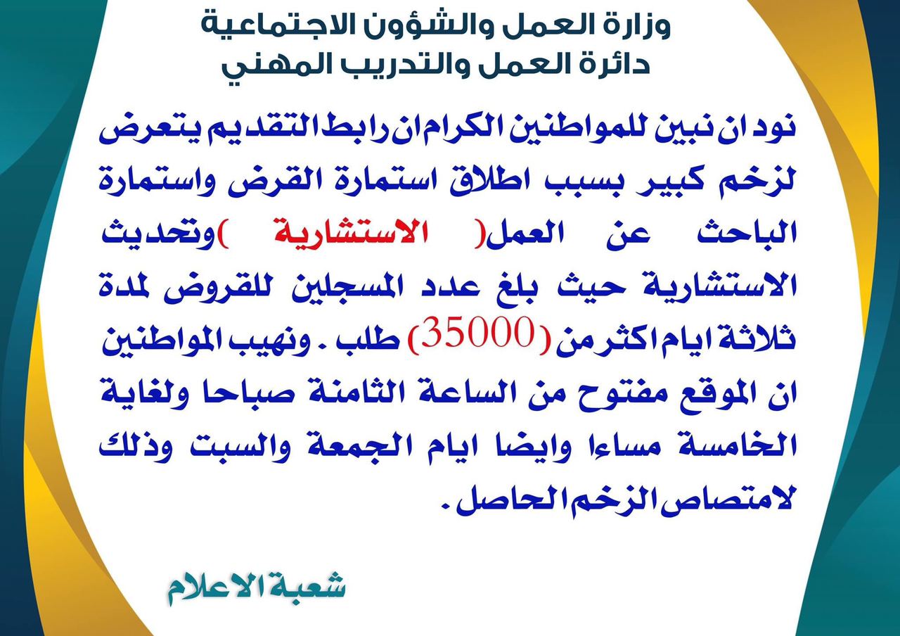 استمارة تقديم قروض العاطلين عبر موقع وزارة العمل العراقية خبرنا