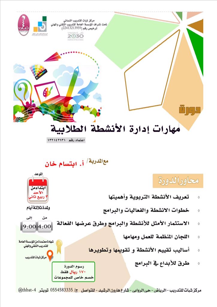 مركز ثبات للتدريب On Twitter دورة مهارات إدارة الأنشطة الطلابية دورة النجاح في العلاقات الشخصية دورة إدارة وبناء فرق العمل للتسجيل Https T Co G9f36httqd دورات Https T Co Jjmghbsmus