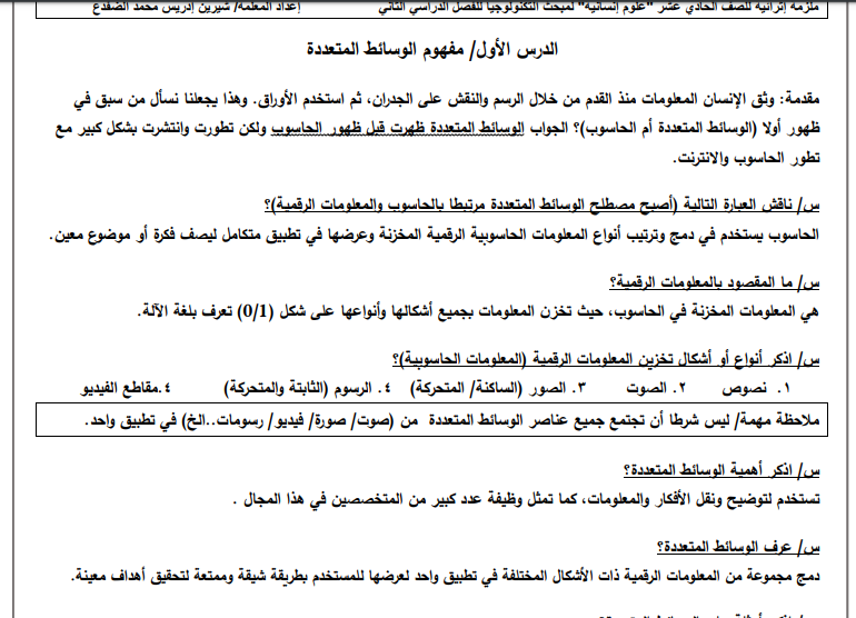 ملزمة إثرائية في الوحدة الثالثة الوسائط المتعددة للصف الحادي عشر أدبي الفصل الثاني المنهاج الفلسطيني الجديد