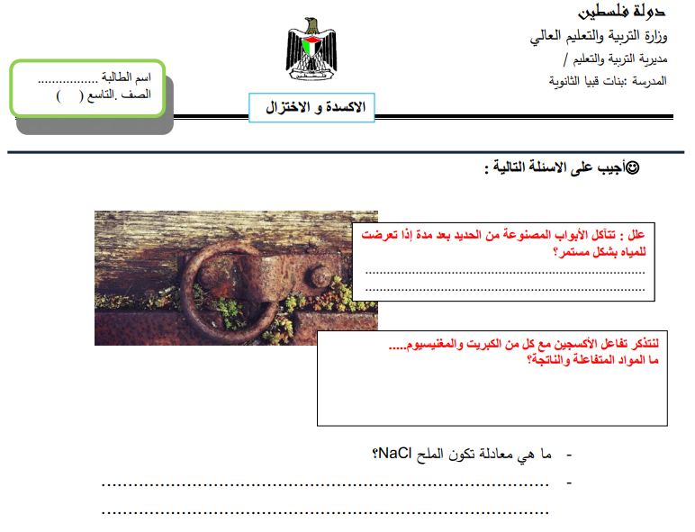 ورقة عمل لدرس الأكسدة والاختزال للصف التاسع الفصل الثاني المنهاج الفلسطيني الجديد