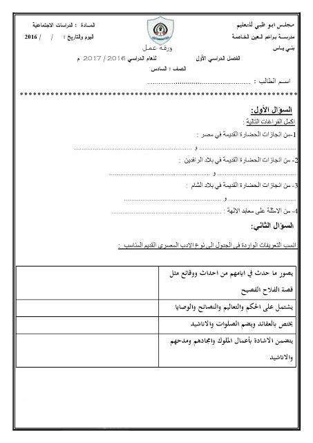 مدونة تعلم أوراق عمل دراسات اجتماعية للصف السادس الفصل الدراسي الأول