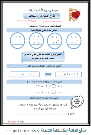 ورقة عمل لدرس طرح عددين ضمن 99 دون استلاف للصف الثاني الفصل الأول المكتبة الفلسطينية الشاملة