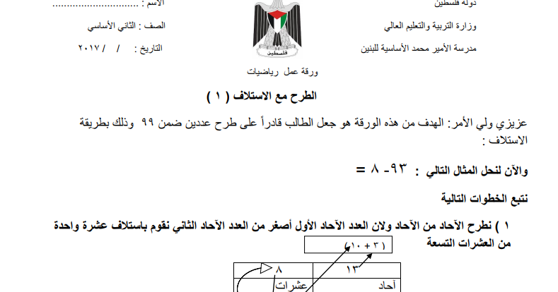 أوراق عمل رائعة لطرح عددين ضمن 999 مع الاستلاف لرياضيات ثالث الفصل الأول ملتقى تعليم فلسطين