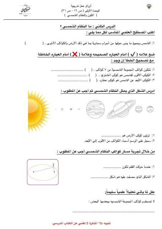 اوراق عمل علوم وحدة الكون والنظام الشمسي فصل اول أ شيماء العنزي مدرستي الكويتية