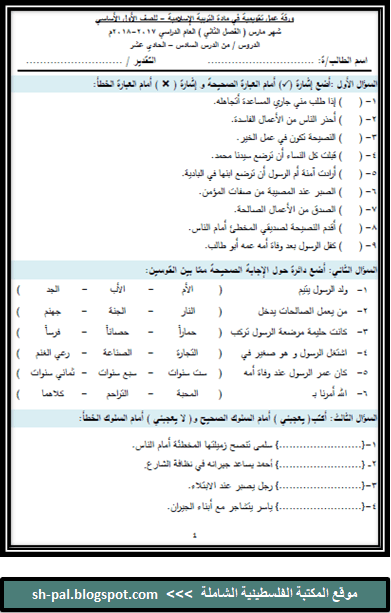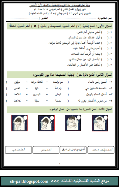 أوراق عمل تقويمية في جميع المواد لشهر مارس للصف الأول الفصل الثاني منتديات المعلم الفلسطيني