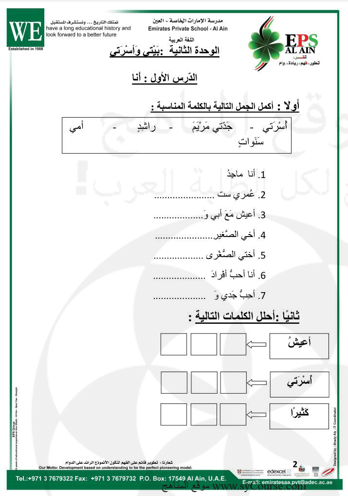 أوراق عمل الوحدة الثانية بيتي وأسرتي ـ صور الصف الأول لغة عربية الفصل الثاني 2016 2017 المناهج الإماراتية