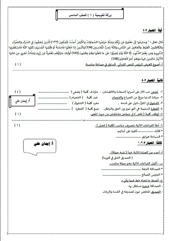 ورقة تقويمية 1 لغة عربية للصف السادس الوحدة الثانية الفصل الاول ايمان علي مدرستي الكويتية