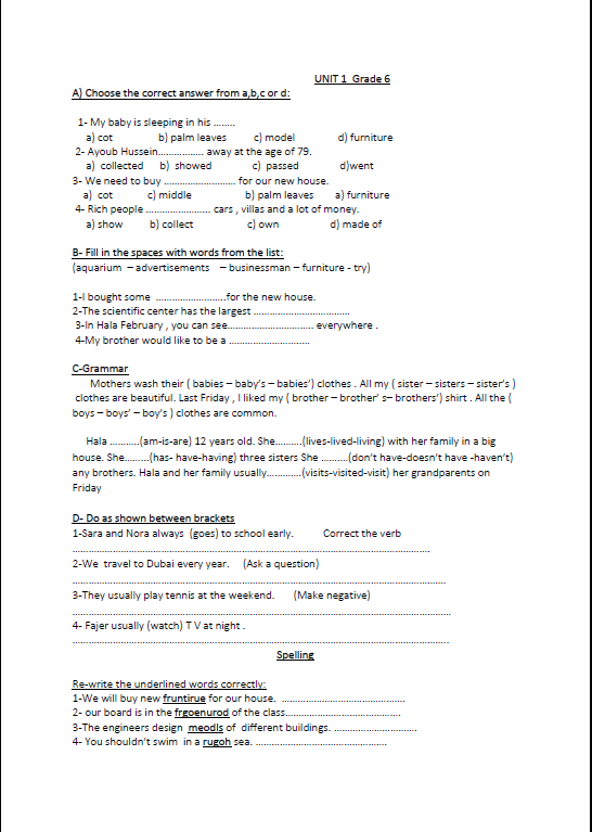 اللغة الإنجليزة ورقة عمل Unit 1 للصف السادس مع الإجابات ملفاتي