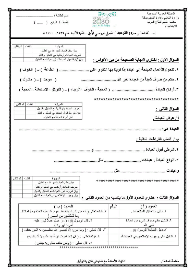 نموذج اختبار في مادة التوحيد للصف الرابع الإبتدائي الفصل الدراسي الأول العلوم والتكنولوجيا