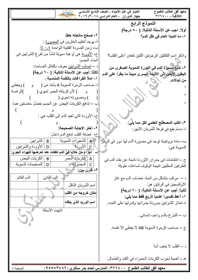 أربعة نماذج امتحانية في بحث جهاز الدوران من مادة العلوم للصف التاسع الفصل الثاني 2019 أ أحمد سنكري
