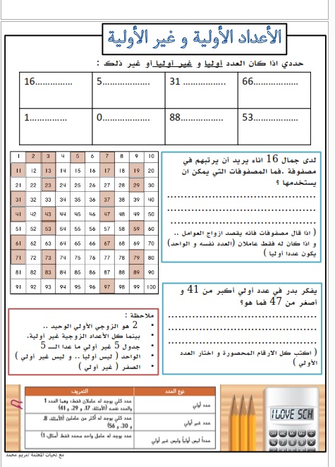 أوراق عمل درس الأعداد الأولية والأعداد غير الأولية