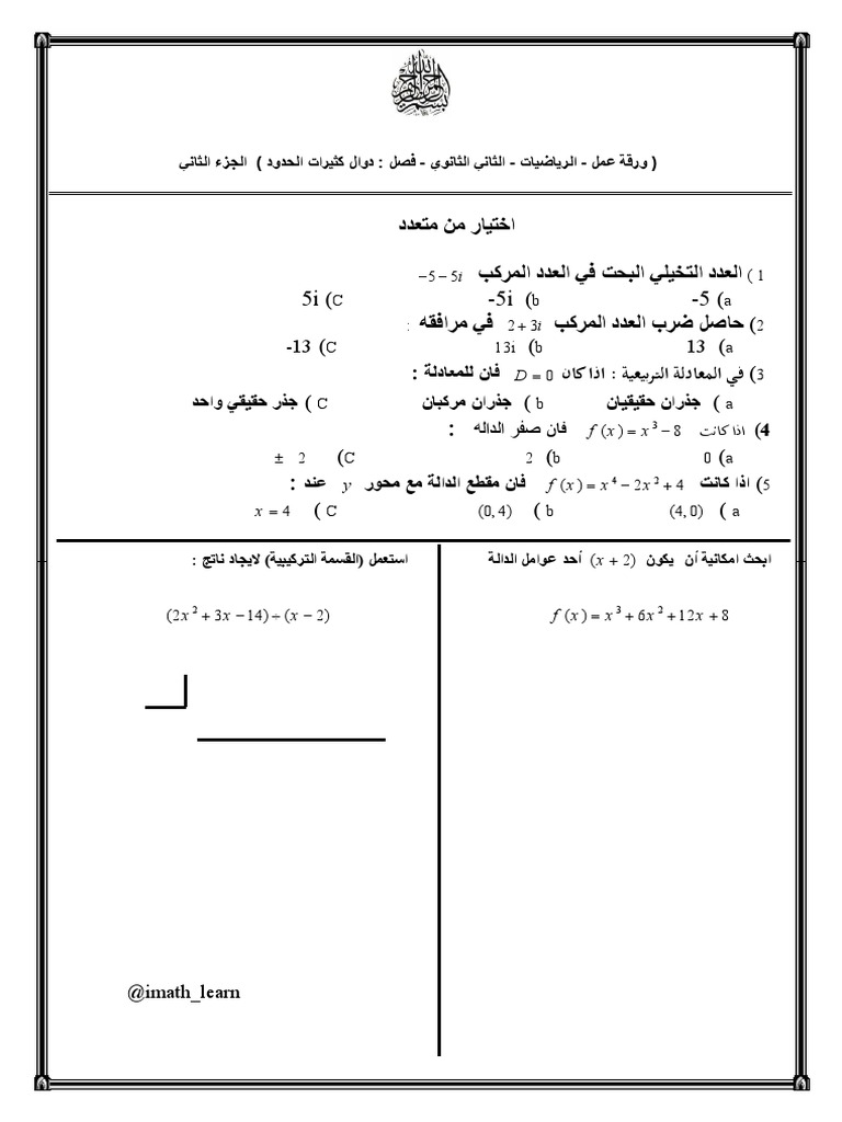 ورقة عمل قسمة كثيرات الحدود المستوى الثاني رياضيات الفصل الثاني المناهج السعودية