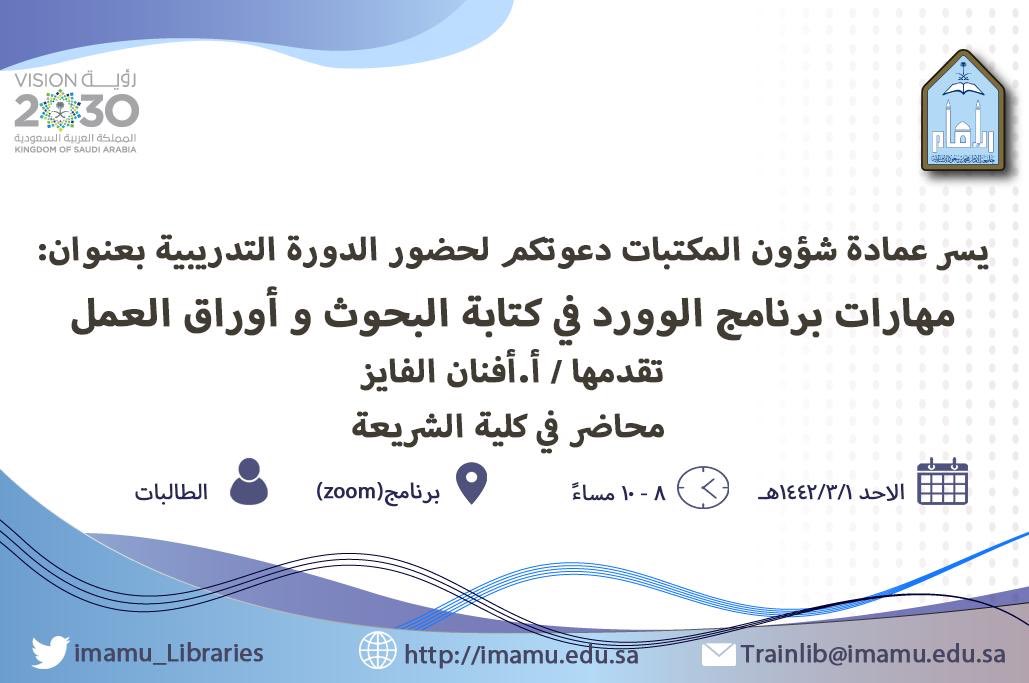 عمادة شؤون المكتبات On Twitter إعلان يسرنا دعوتكم لحضور دورة تدريبية بعنوان مهارات برنامج الوورد في كتابة البحوث وأوراق العمل تقدمها أ أفنان الفايز التفاصيل الدورة ستقام عبر منصة Zoom للتسجيل من