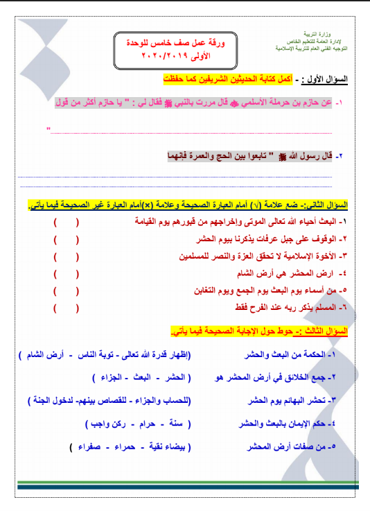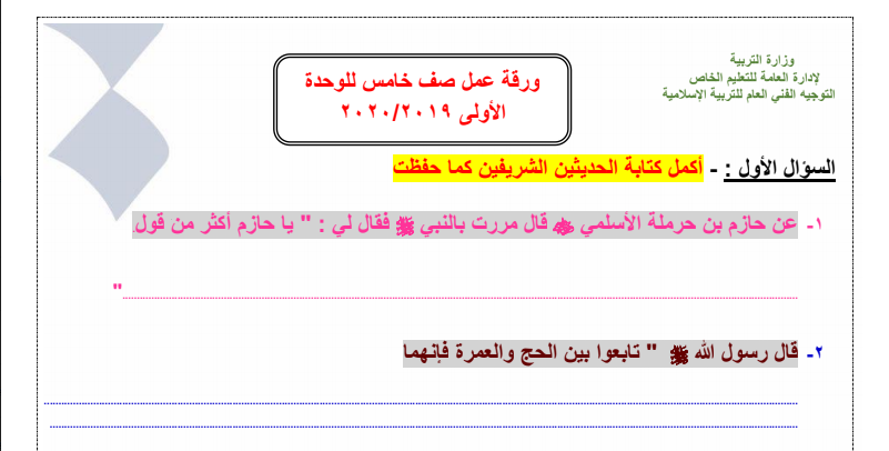 أوراق عمل في التربية الإسلامية للصف الخامس الفصل الأول المكتبة الفلسطينية الشاملة