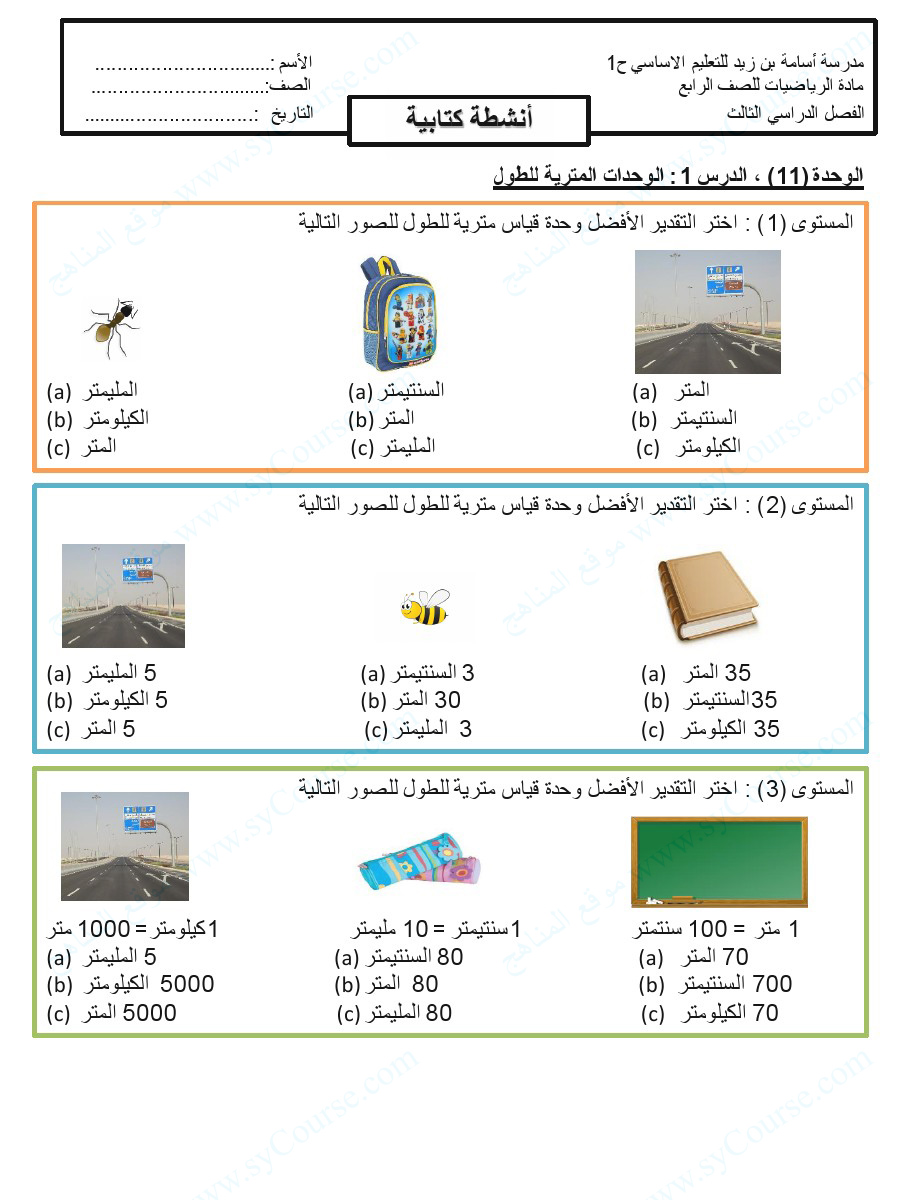 أوراق عمل الوحدتين ال11 و12 في الرياضيات للصف الرابع الفصل الدراسي الثالث العلوم والتكنولوجيا