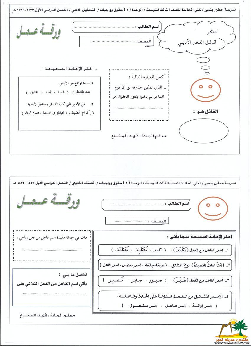 أوراق عمـل للوحدة الأولى لمـادة لغتي الخـالـدة للصف الأول المتوسط