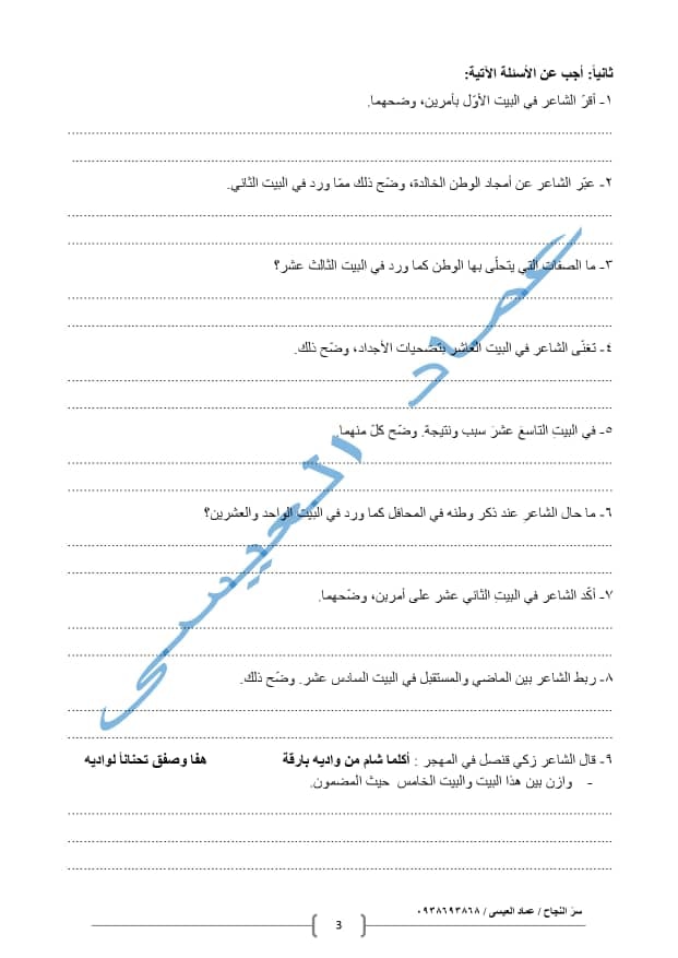 أوراق عمل لقصيدة الوطن في اللغة العربية للصف الثالث الثانوي الفصل الثاني