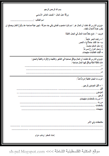 ورقة عمل درس الحال للصف العاشر الفصل الأول المكتبة الفلسطينية الشاملة