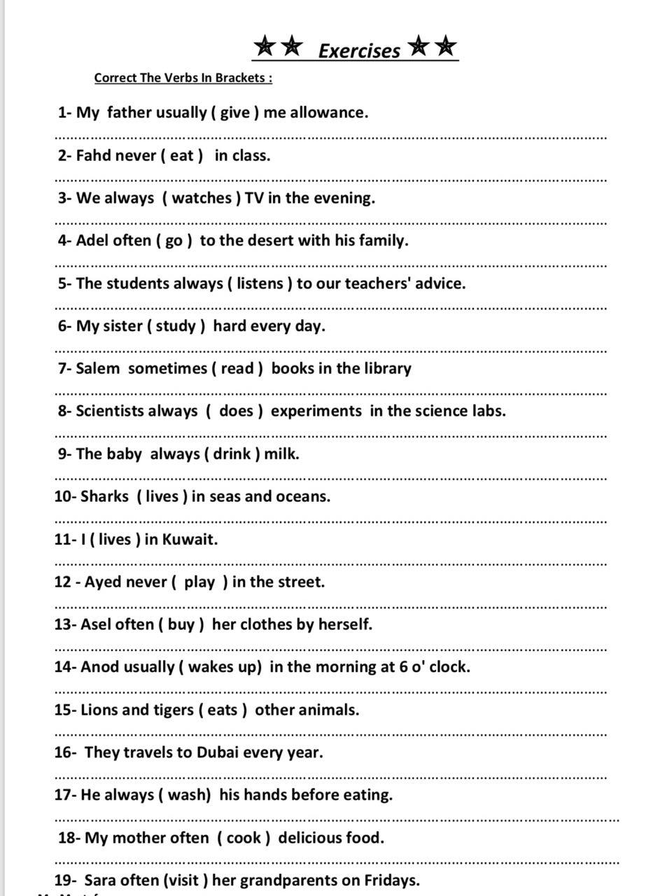 ورقة عمل علي المضارع البسيط الكويت التعليمية