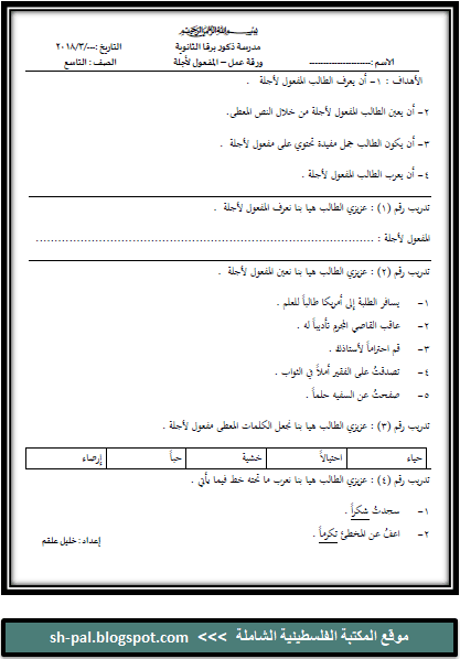 ورقة عمل لدرس المفعول لأجله للصف التاسع الفصل الثاني المكتبة الفلسطينية الشاملة
