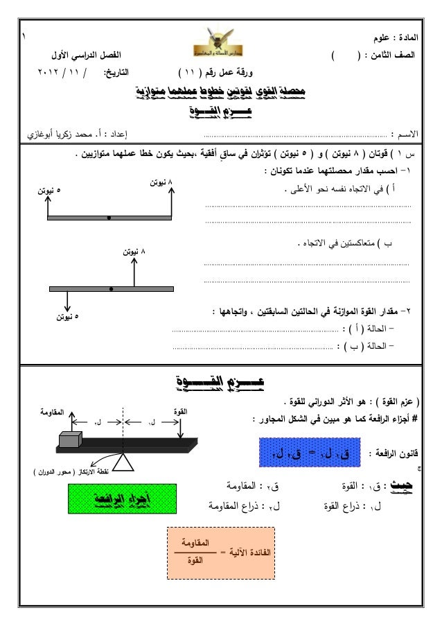 علوم الصف الثامن ورقة عمل 10 محصلة القوى