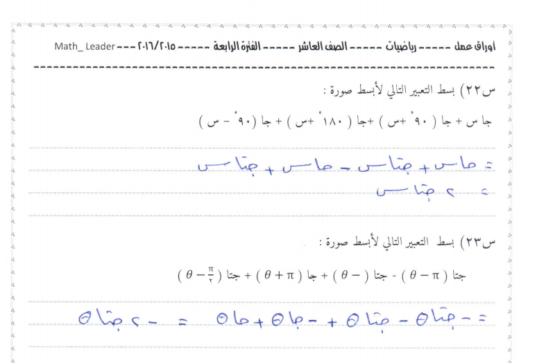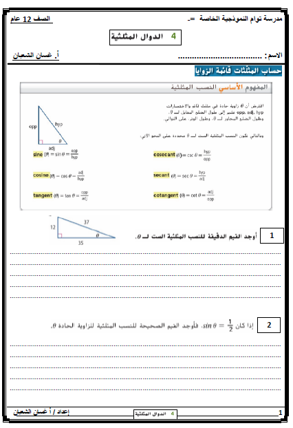 الرياضيات المتكاملة أوراق عمل حساب المثلثات للصف الثاني عشر عام ملفاتي