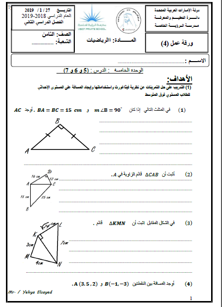 ورقة عمل لوحدة المثلثات ونظريات فيثلغورس الدرس 5 و 6 و 7 لمادة الرياضيات المتكاملة الصف الثامن الفصل الثاني منتديات صقر الجنوب