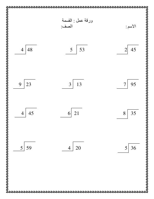 اوراق عمل رياضيات للصف الثالث عن القسمة