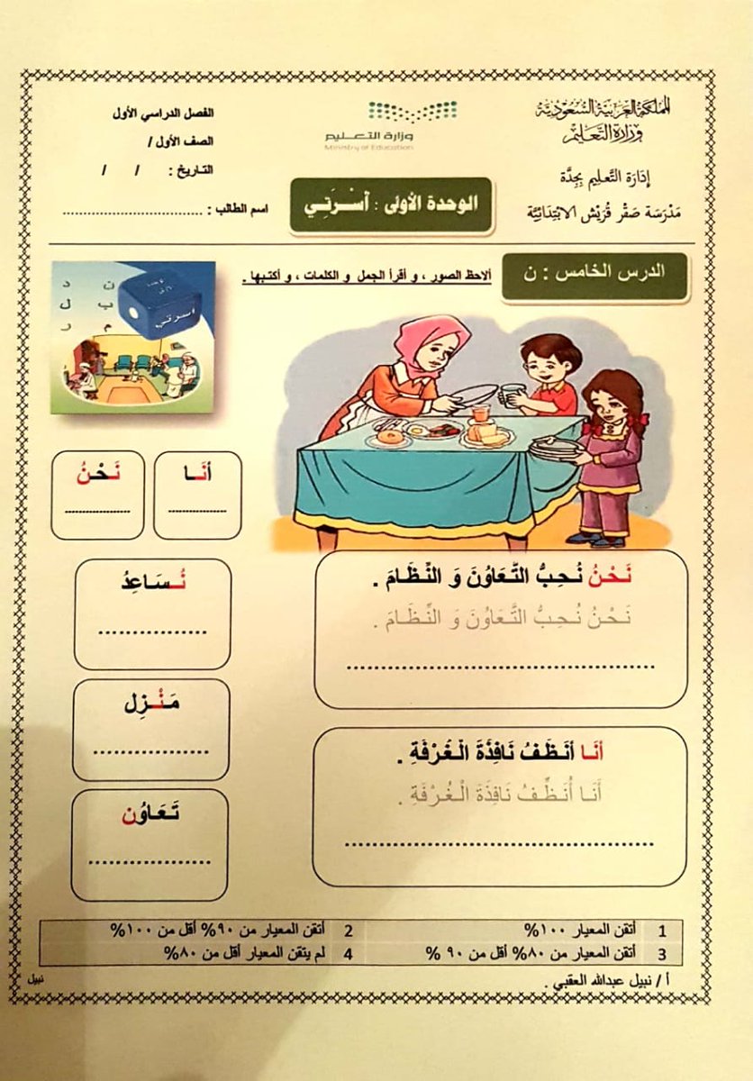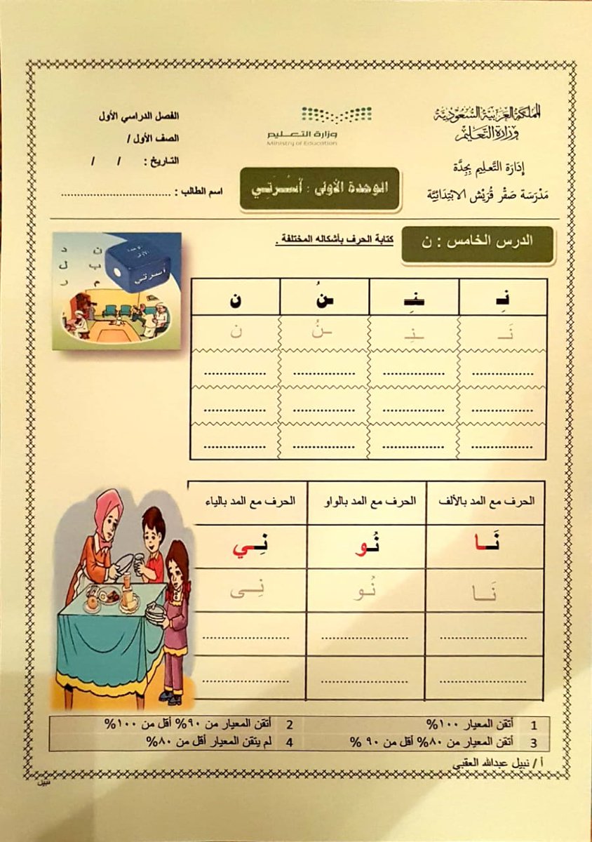 Nabeel Alokbe نبيل العقبي On Twitter أوراق عمل الدرس الخامس حرف ن كتابة الحرف بأشكاله و قراءة جمل الدرس قراءة بصرية مع نسخ الجمل والكلمات ملاحظة التركيز في الوحدة الأولى على الكتابة
