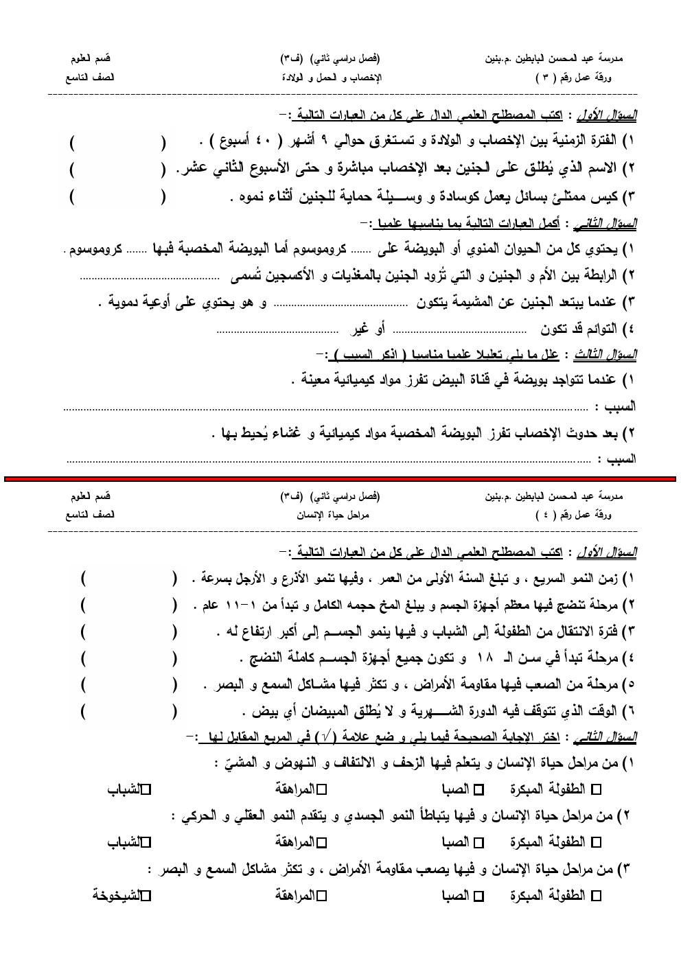 اوراق عمل الصف التاسع علوم الفصل الثاني ملفات الكويت التعليمية