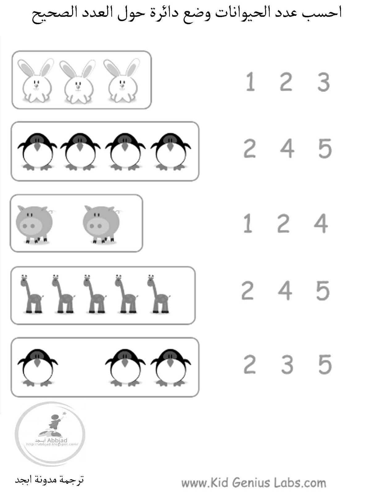 مجموعة من اوراق عمل لـ تعليم الحساب والعد ضع دائرة مدونة أبــجد Abbjad