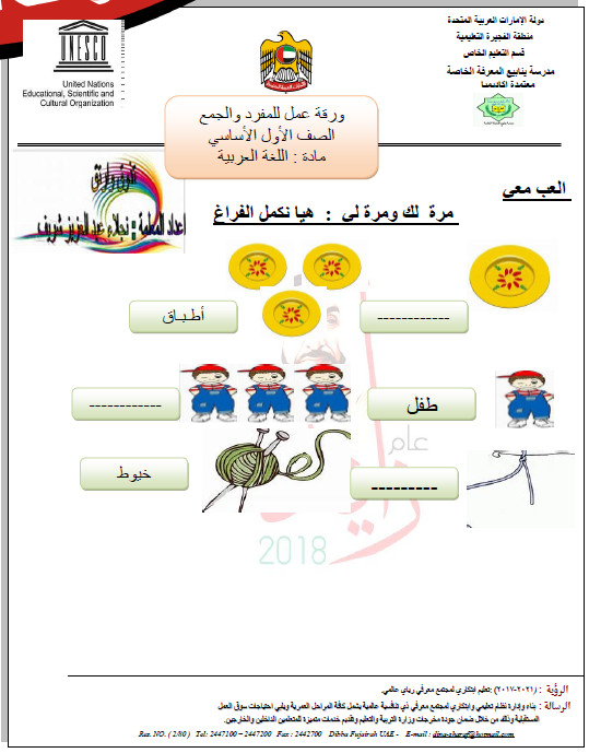 ورقة عمل المفرد و الجمع للصف الاول الفصل الدراسي الثاني مدارس الامارات