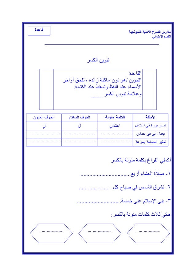 أوراق عمل التنوين الضمة و الكسرة و الفتحة المعلمة أسماء