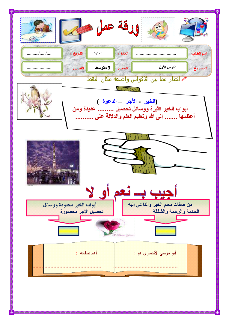 ورقة عمل الدرس الأول في الحديث الخير الأجر الدعوة الصف الثالث متوسط الفصل الاول العلوم والتكنولوجيا