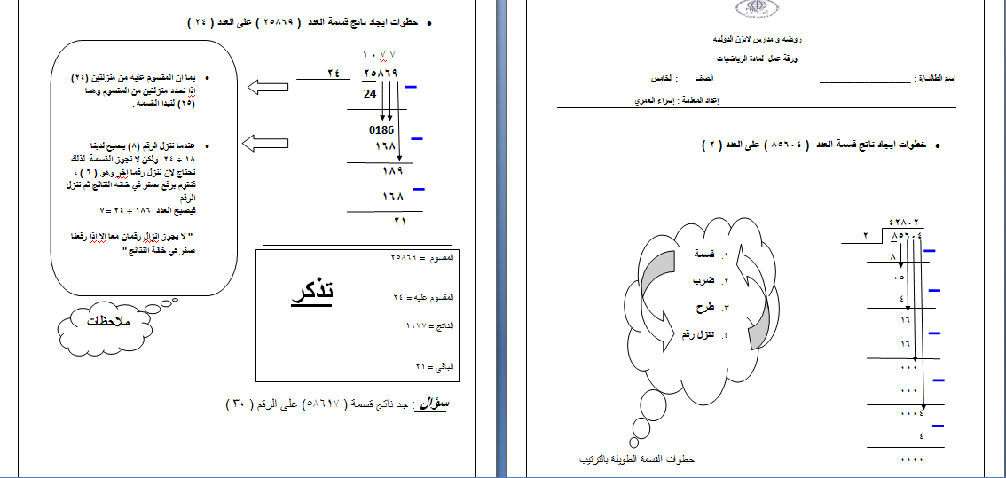ورقة عمل القسمة الطويلة لمادة الرياضيات للصف الخامس الفصل الأول منتديات صقر الجنوب