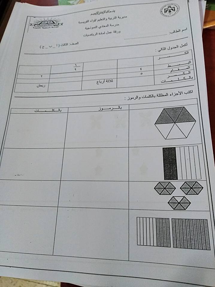 اوراق عمل على وحدة الكسور للصف الثالث طلبة مدرسة ذكور حي الامير حسن الاعدادية الثانية Facebook