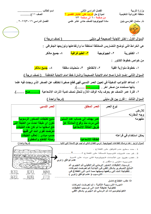 حل تدريب على اختبار قصير جيولوجيا الصف الحادي عشر الفصل الثاني ثانوية سلمان الفارسي 2016 2017 مدرستي الكويتية