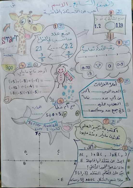اوراق عمل رياضيات للصف السابع باسلوب مميز الفصل الاول اعداد ياسر عمقية
