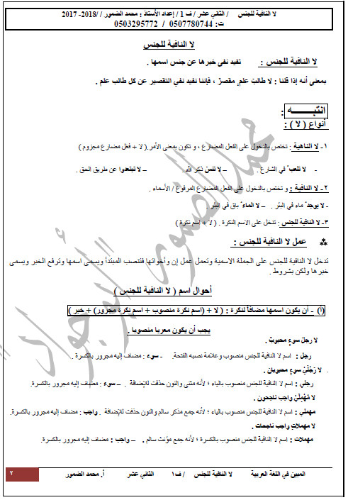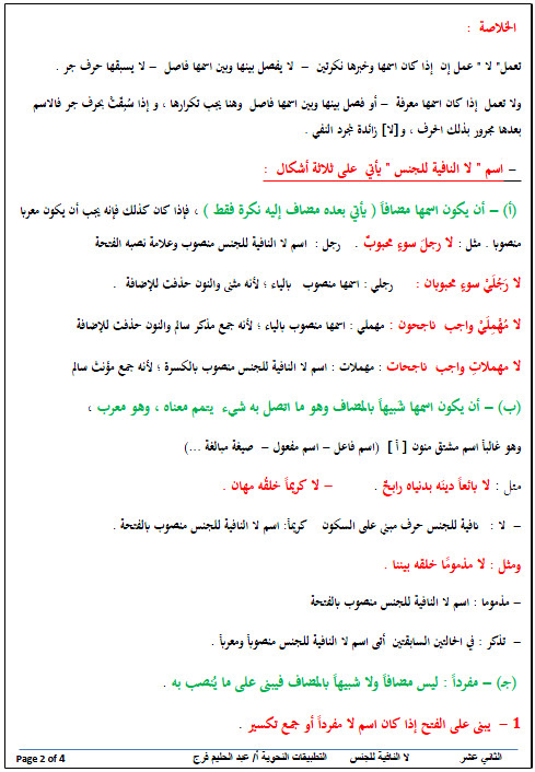 ورقة عمل لا النافية للجنس الصف الثاني عشر مادة اللغة العربية ملفاتي