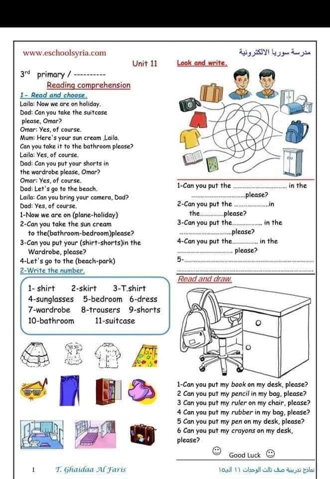 اوراق عمل في اللغة الانجليزية الدرس 17 18 للصف الثالث الفصل الثاني