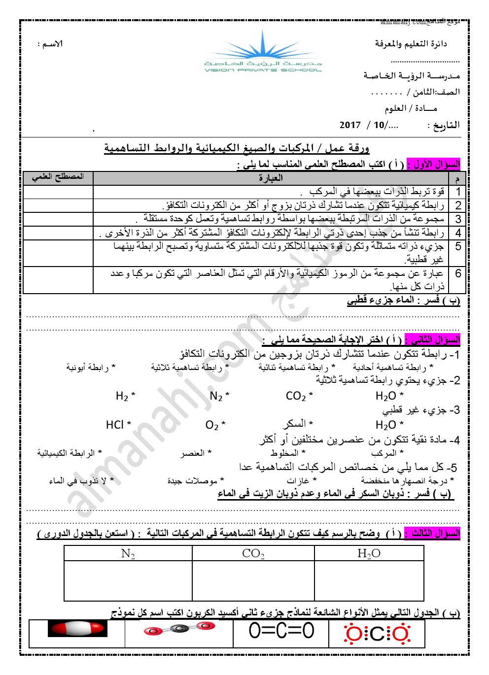 ورقة عمل المركبات والصيغ الكيميائية والروابط التساهمية الصف الثامن علوم الفصل الأول 2017 2018 المناهج الإماراتية